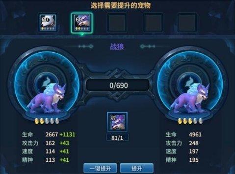 如上圖,消耗寵物碎片來提升寵物的品級,從而帶來屬性值的飛躍,是最有效的寵物提升方式。