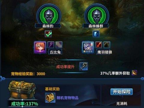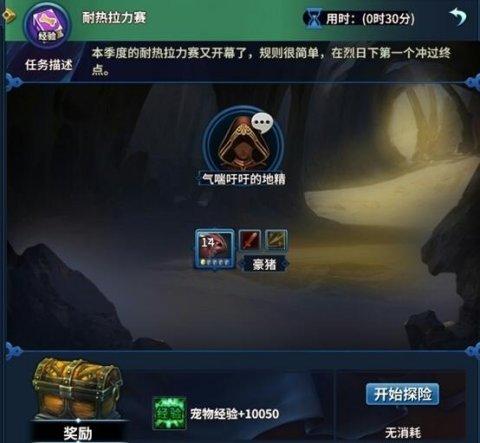 在主城的NPC喵寧處有半個小時一次的經(jīng)驗獎勵型寵物探險,可以快速提升寵物等級。不過需要注意的是寵物參與探險時,不能再參與戰(zhàn)斗。