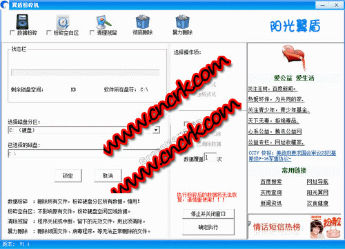 翼盾文件粉碎機(jī)是一款綠色軟件,您不需要支付任何費(fèi)用。翼盾粉碎機(jī),可顯示當(dāng)前執(zhí)行的次數(shù),整盤(pán)文件粉碎,空白區(qū)域覆蓋,文件及文件夾徹底刪除,徹底銷(xiāo)毀重要文件數(shù)據(jù)使其不可恢復(fù)。平時(shí)系統(tǒng)中的刪除其實(shí)只是把文件標(biāo)記為刪除,并沒(méi)有改變文件在硬盤(pán)中的數(shù)據(jù),恢復(fù)軟件可以輕易的找到數(shù)據(jù)并還原文件。
