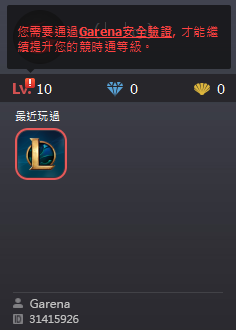 狀況三、「您需要通過 Garena 安全認(rèn)證,才能繼續(xù)提升您的 Garena 電腦版等級(jí)?!?br />