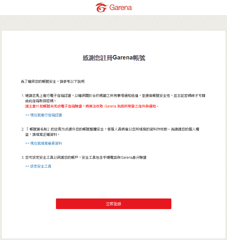3. 按下【立刻注冊(cè)】即完成Garena帳號(hào)申請(qǐng),系統(tǒng)會(huì)自動(dòng)導(dǎo)向[感謝您注冊(cè)Garena帳號(hào)]的畫面顯示,請(qǐng)依據(jù)網(wǎng)頁(yè)說明至帳戶中心完成:綁定身分證字號(hào)、電子信箱認(rèn)證、手機(jī)認(rèn)證。