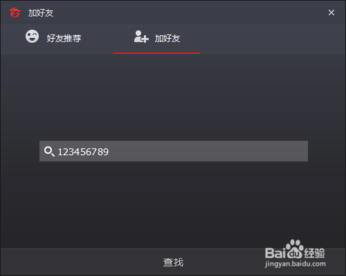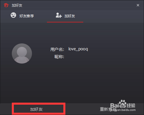 接下來(lái)會(huì)彈出好友添加窗口,我們輸入好友的ID賬號(hào),然后進(jìn)行搜索你會(huì)看到你好友的信息,我們選擇下方的添加就可以添加好友了。