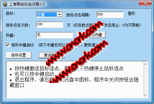 上海青鼠標(biāo)連點(diǎn)器可以自由設(shè)置單擊鼠標(biāo)間隔時(shí)間及單擊方式(左鍵、右鍵),只需要將鼠標(biāo)移動(dòng)到需要連點(diǎn)的地方,然后按相應(yīng)熱鍵就可以啟動(dòng)連點(diǎn)了,再按下相應(yīng)熱鍵停止。特色之處,還可以通過(guò)中鍵啟動(dòng)點(diǎn)擊