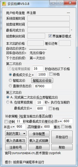 云云拍牌助手是一款智能拍牌軟件,可以自動(dòng)出價(jià),加價(jià),幫助用戶(hù)提高拍牌的成功率,而且軟件帶有模擬拍牌功能,可以讓用戶(hù)在正式拍牌之前進(jìn)行模擬,熟悉拍牌規(guī)則,提高成功率。【軟件特點(diǎn)】