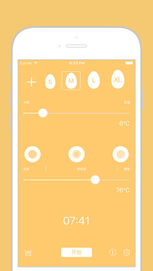 煮蛋定時器app操作界面比較簡單,由上至下分別考慮到蛋的大小、蛋的溫度和蛋黃的固化程度,以及需要煮的時間。蛋的大小