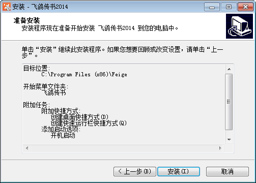 下載飛鴿傳書版安裝包,解壓Feige_for_Windows.rar文件,雙擊.exe文件執(zhí)行安裝,在安裝過程中,可以自定義程序安裝路徑、文件夾名稱和快捷方式設(shè)置選項。