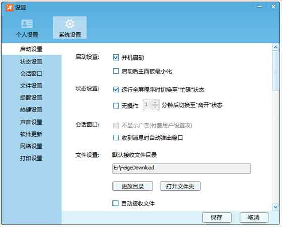 “系統(tǒng)設(shè)置”中可以修改開機啟動項、文件默認接收目錄和自動接收、消息提醒以及自動更新等選項。
