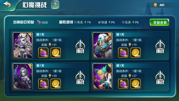 在心魔挑戰(zhàn)中,殿下可以查看到能夠挑戰(zhàn)的英雄。達到挑戰(zhàn)條件規(guī)定的等級和星級要求便可以挑戰(zhàn)。挑戰(zhàn)勝利后可以金幣、英雄經(jīng)驗以及積分。當積分達到指定條件后可獲得三維屬性加成,高級的積分分段每天還會發(fā)放大量的英雄經(jīng)驗。