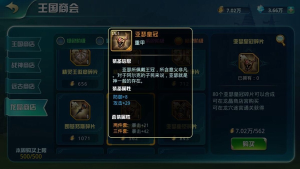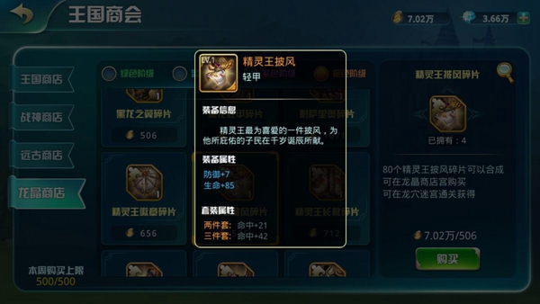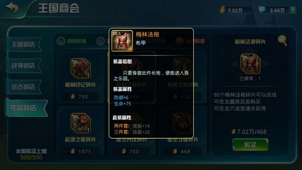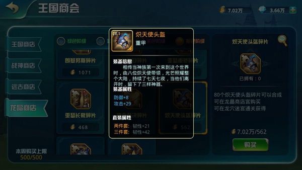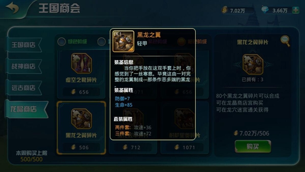 龍晶幣可購買綠色階級裝備碎片、藍色階級裝備碎片(龍穴迷宮通過10層可購買)、紫色階級裝備碎片(龍穴迷宮通過20層可購買)、橙色階級裝備碎片(龍穴迷宮通過30層可購買);藍色階級以上的裝備,擁有套裝屬性哦!