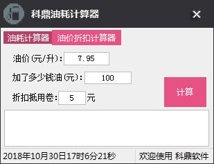 2、根據(jù)軟件界面的提示,輸入油價(jià)、加油金額、行駛公里數(shù),點(diǎn)擊計(jì)算即可獲得油耗數(shù)據(jù)。