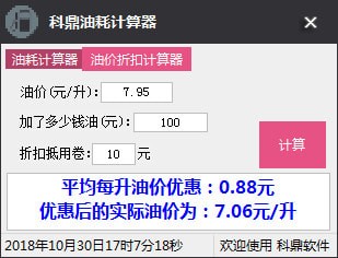 3、輸入當(dāng)前油價(jià),加油金額,折扣金額,點(diǎn)擊計(jì)算即可獲得每升優(yōu)惠價(jià)格
