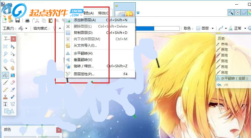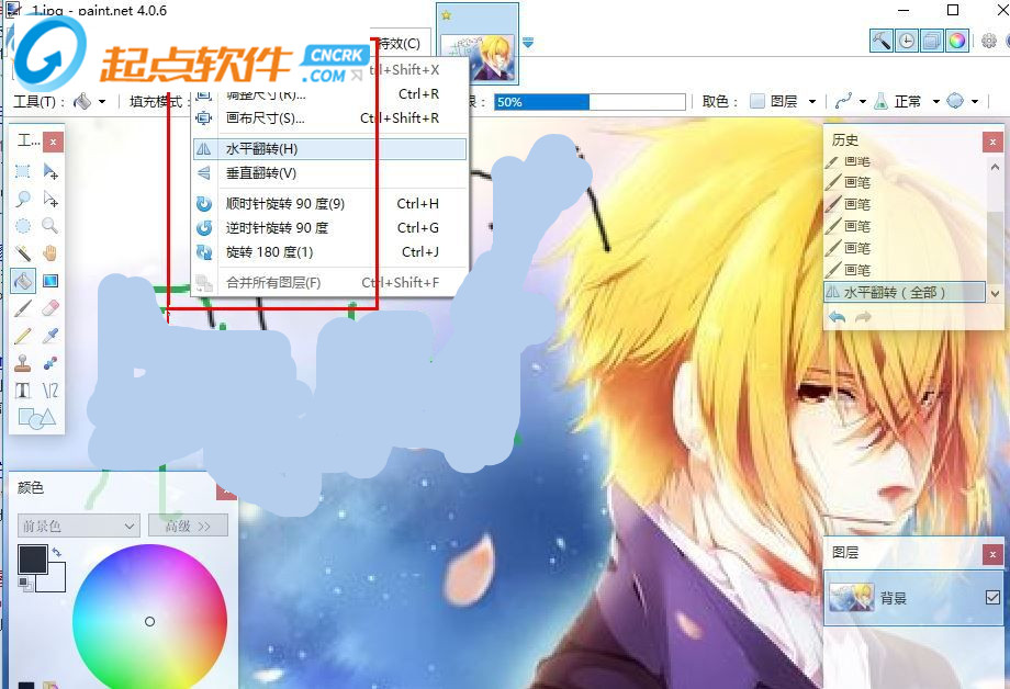 5、圖片編輯功能,支持水平翻轉(zhuǎn)、畫布尺寸、調(diào)整尺寸、垂直翻轉(zhuǎn)、加載圖片到選擇區(qū)域