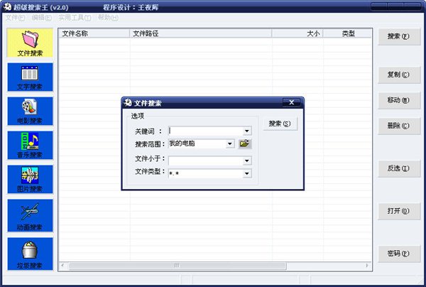 超級搜索王用于取代windows 系統(tǒng)自帶的文件搜索功能。你還在為 windows 自帶的文件搜索功能速度慢、響應遲鈍而發(fā)愁嗎?那就試一試新一代的《超級搜索王》吧,從此你將會享受風馳電掣般的搜索速度,眨眼間的功夫搜索結(jié)果已經(jīng)完成。不僅如此,她的搜索范圍更廣,連垃圾箱(回收站)也不放過,就更別提系統(tǒng)隱含文件了。作為一款本地搜索軟件的王者,利用她搜索電影、音樂、Flash動畫、圖片等更加快捷方便。1:文件搜索
