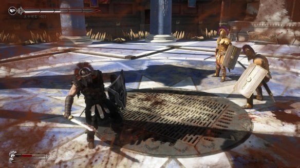 第一個(gè)“庭院Courtyard”是廣闊卻充滿著沙石的空間,但并沒有更多顯著的地形環(huán)境。游戲一開始非常直接,跳出了一波野蠻人的部隊(duì),去把他們?nèi)冀o砍倒吧!但接著游戲就開始變得更加有趣了,針刺與火焰的陷阱開始從地面竄出,讓我們不得不閃避這些額外的災(zāi)害地區(qū)(或者是把我們的敵人給打進(jìn)去)。接著戰(zhàn)斗中的目標(biāo)就變更了,迫使我們必須採取防御姿態(tài)先清空一個(gè)區(qū)域中的入侵者, 接著又放出了一些比一般野蠻人更強(qiáng)大的領(lǐng)隊(duì)出來。游戲中的操作非常令人熟悉,利用武器劈砍的連段與利用盾牌招架敵人攻擊,雖然有些時(shí)候競(jìng)技場(chǎng)中的黑影會(huì)讓游戲的視角沒辦法鎖定在我們角斗士的肩膀上,讓人不知道現(xiàn)在戰(zhàn)場(chǎng)上究竟發(fā)生了什么事情(但狂按攻擊通常就能讓你度過這種狀況)。