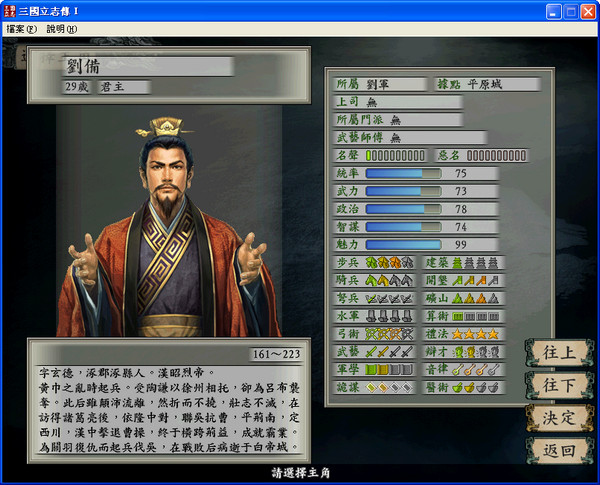 光譜在《富甲天下》系列大受好評(píng)之后再接再厲,于2001年夏季推出了這款融合RPG和SLG游戲精華的Q版《三國(guó)立志傳[1]》?!度龂?guó)立志傳》的靈感來(lái)源于光譜之前開發(fā)的《學(xué)生騎士團(tuán)》,以人才招募、技能學(xué)習(xí)、人物養(yǎng)成等特色相輔相成,并且融入了《三國(guó)志》的攻城設(shè)計(jì)?!度龂?guó)立志傳》的情節(jié)非常惡搞,故事的起因是愛哭鬼劉備、厚臉皮的關(guān)羽和脾氣暴躁的張飛準(zhǔn)備桃園結(jié)義,結(jié)果用來(lái)拜天地的結(jié)義桃被黃巾軍搶走,大為憤怒的三人因此決定揭竿而起鬧革命。《三國(guó)立志傳》游戲的第一個(gè)步驟就是要到處招募人才,玩家可以通過完成特定人物招募,也可以主動(dòng)出擊,到客棧尋訪人才,并且用金錢拉攏。能力越高的武將費(fèi)用越高,不過也可以通過派出魅力高的武將拉攏人心,由此節(jié)約費(fèi)用。武將的技能除了可以在戰(zhàn)斗中積累外,也可以到學(xué)堂中學(xué)習(xí),口才和經(jīng)驗(yàn)值越高的武將教書的效果就越明顯?!度龂?guó)立志傳》在情節(jié)上采用網(wǎng)狀結(jié)構(gòu),游戲過程中的不同選擇會(huì)有不同的結(jié)果,三國(guó)歷史中的經(jīng)典事件也會(huì)因?yàn)橥婕业木駬穸耆騺y順序