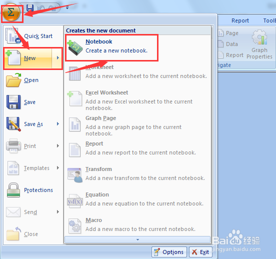 用過(guò)excel的人都知道,將鼠標(biāo)放在工具欄左上角的西格瑪(Σ)圖標(biāo)上,然后出現(xiàn)的是圖三畫面,點(diǎn)擊工具欄中的新建圖標(biāo)(New),接著點(diǎn)擊notebook,即新建一個(gè)notebook。(之后表格、圖表都將會(huì)自動(dòng)放置在這個(gè)notebook里面)