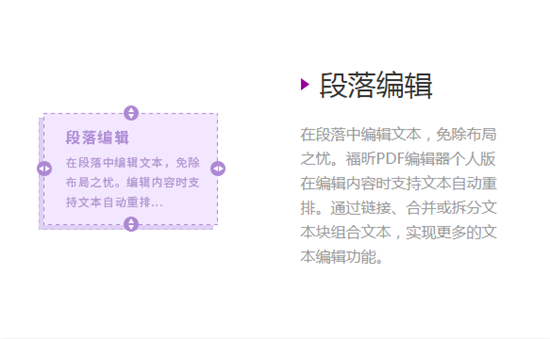 段落編輯在段落中編輯文本,免除布局之憂。福昕PDF編輯器在編輯內(nèi)容時支持文本自動重排。通過鏈接、合并或拆分文本塊組合文本,實現(xiàn)更多的文本編輯功能。