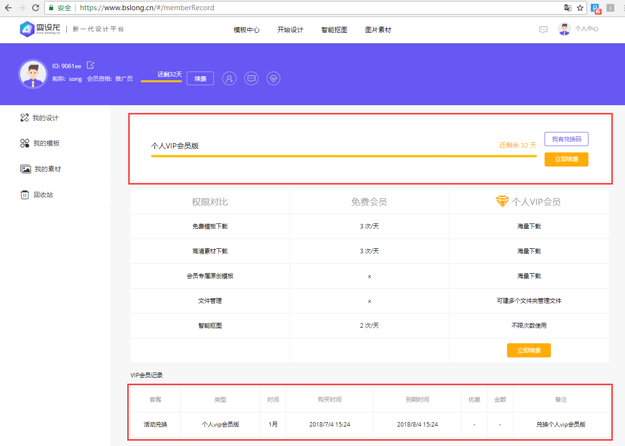 5、會員兌換碼兌換成功后在底部的VIP會員記錄會有兌換記錄展示。