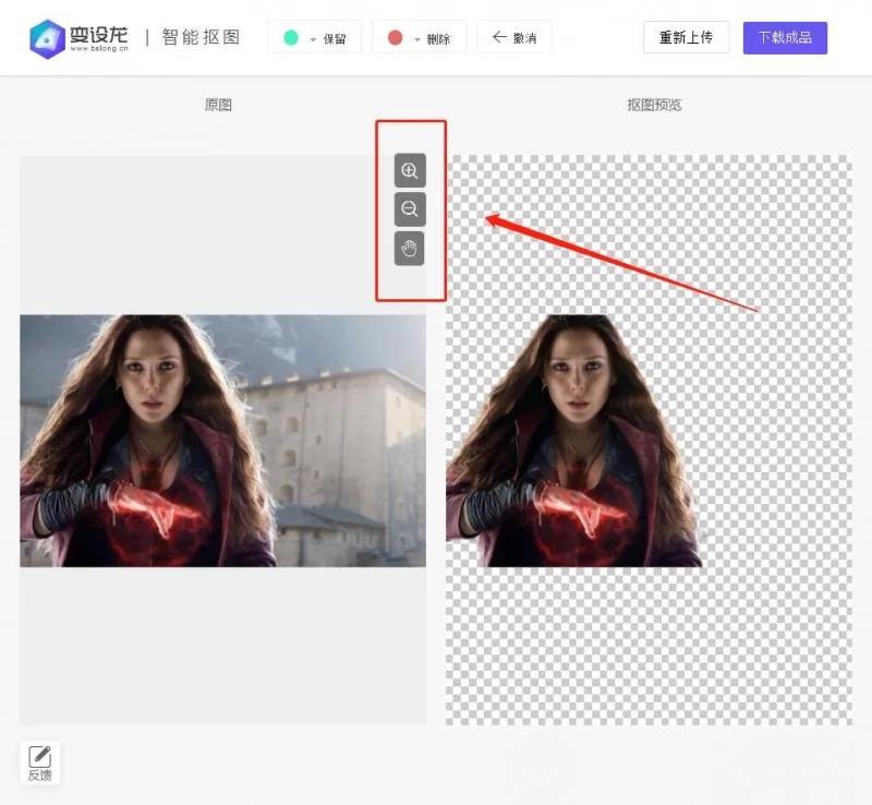 7、選擇完保留元素和刪除元素后可以看到右邊的效果預(yù)覽圖已經(jīng)根據(jù)你的需求已經(jīng)計算出了摳圖的效果了(一定要保留和刪除都畫上去后才會出現(xiàn)效果圖哦,如果你只保留,沒有刪除,AI也是不懂你的意思的哦,反之亦然),如果有一些細節(jié)不是很滿意,可以選擇中間的放大和移動功能進行精細化操作。