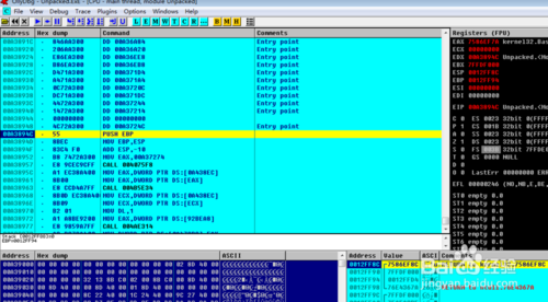 數(shù)據(jù)格式:OllyDbg 的數(shù)據(jù)窗口能夠顯示的所有數(shù)據(jù)格式:HEX、ASCⅡ、UNICODE、 16/32位有/無(wú)符號(hào)/HEX整數(shù)、32/64/80位浮點(diǎn)數(shù)、地址、反匯編(MASM、IDEAL或是HLA)、PE文件頭或線程數(shù)據(jù)塊。