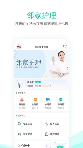 很高興,通過(guò)鄰家護(hù)理共享平臺(tái),我們能夠幫助有理想有抱負(fù)的護(hù)理人員成功建立個(gè)人的護(hù)理事業(yè)。關(guān)愛(ài)病人、關(guān)懷家庭、關(guān)心護(hù)士、為老齡社會(huì)創(chuàng)造價(jià)值,是我們的初心,也是我們的諾言。為此,我們將與您攜手共筑護(hù)理人員永久護(hù)理事業(yè)的春天,我們也為所有注冊(cè)鄰家護(hù)理共享平臺(tái)且提供護(hù)理服務(wù)的全體護(hù)理同仁提供全方位的保障!