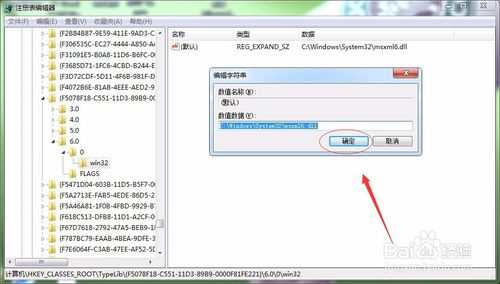 在彈出的編輯字符串對(duì)話框輸入新的地址“C:\Windows\System32\msxml6.dll”單擊確定,然后再去看下是否就可以安裝軟件了