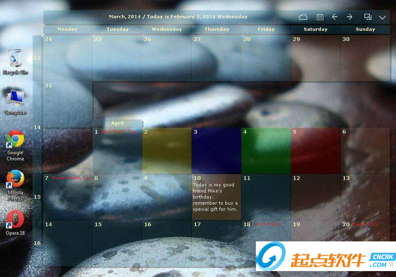 桌面日歷desktopcal是一款放置在桌面上的很酷的日歷軟件.桌面日歷幫您輕松管理約會(huì)、待辦事項(xiàng)、日程安排.在桌面上記錄瑣事.不僅如此,桌面日歷?還提供萬(wàn)年農(nóng)歷、節(jié)氣與各種常見的節(jié)慶、紀(jì)念日等信息.桌面日歷desktopcal v1.1.2.1850更新:+ 增加時(shí)區(qū)配置功能.+ 增加打印功能.+ 增加泰國(guó)語(yǔ)版本.* 修正崩潰 0002522D,12點(diǎn)的時(shí)候崩潰.* 修正菜單字體不統(tǒng)一的問題.* 修正日歷上星期字體不統(tǒng)一的問題.