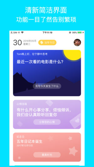 ● 寫上幾行文字,選擇當天心情和天氣,簡單完成日記,使用五年日記本app不用再為寫什么而煩惱;