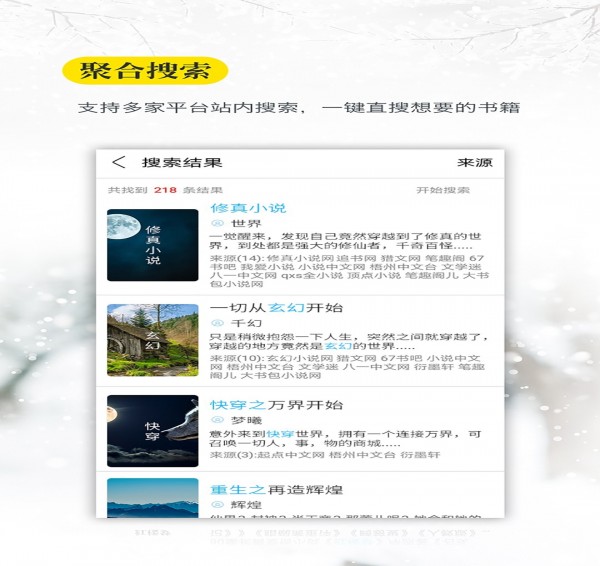 1.支持實時跨站搜索全網(wǎng)熱門小說,。更有貼心的實時更新提醒功能,一鍵打開就可以閱讀到全新章節(jié)。2.時下熱門小說閱讀書城,各種全本免費小說全部免費看。