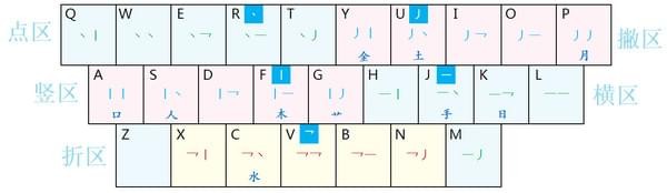 如: 雨 YJV = Y(首音)+J(一丨)+V(丶)
