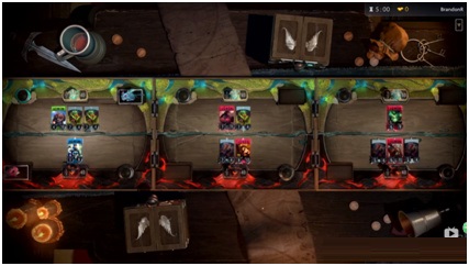 上圖就是一局Artifact的完整棋盤。棋盤共分為左,中,右三路。玩家將會從左路開始,依次進行部署及戰(zhàn)斗,具體流程將在后面描述。