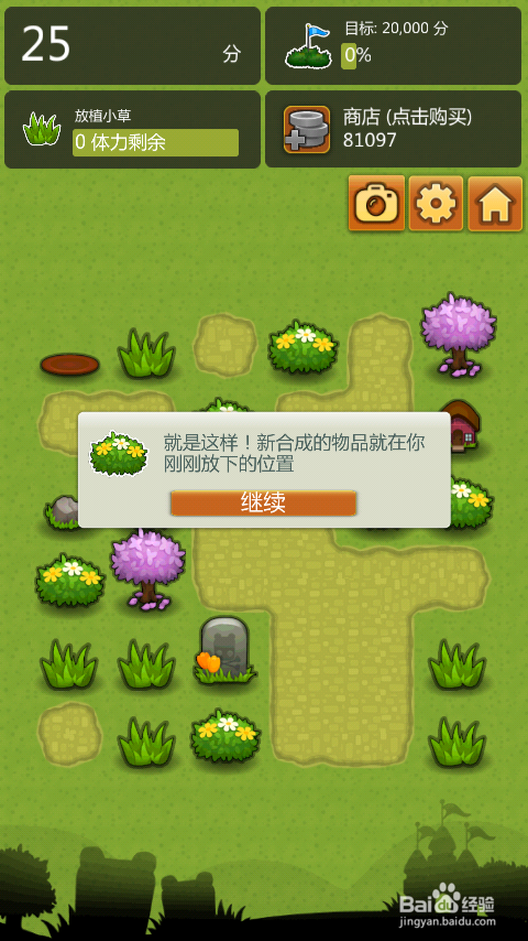 2.游戲規(guī)則,三重鎮(zhèn)嘛,所以是三三一升級(jí)別。三個(gè)小草變成一個(gè)小圓團(tuán),三個(gè)小圓團(tuán)變成一顆大樹(shù),三棵大樹(shù)變成一座小紅屋子; 三個(gè)小紅屋子變成一棟小樓(還可以用水晶將兩個(gè)小紅屋子變成一棟小樓,后面同樣適用),三個(gè)小樓變成一棟大別墅...(哈哈,目前我最多就建出一個(gè)水游臺(tái),不知道還有沒(méi)有玩到更高的朋友,能把水游臺(tái)再合并成神馬未知物?)