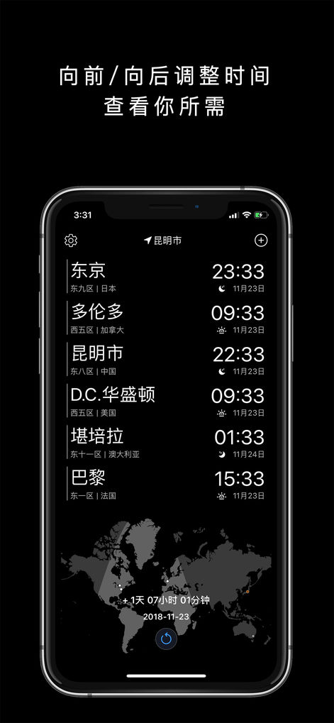 4、在查看未來或過去時(shí)差方面,在世界地圖上左右滑動(dòng),就能直接撥快或撥慢當(dāng)?shù)貢r(shí)間,列表中的所有城市時(shí)間都會(huì)同步變化,查看未來時(shí)間的各地時(shí)差,非常方便。