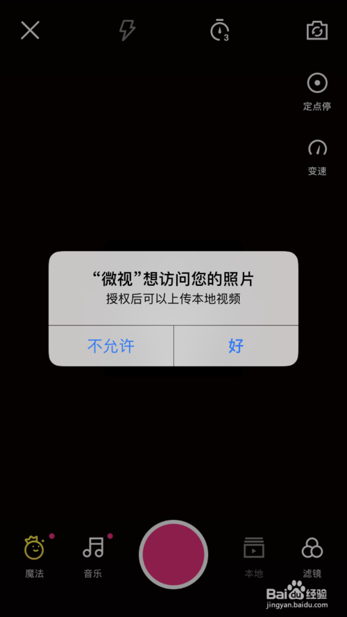再回到主頁上,點一下發(fā)布的小照相鍵。微視會要求我們把照片的授權(quán)給了,給完之后我們就可以在這里發(fā)視頻了。
