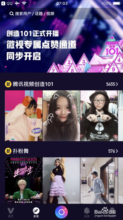 如何使用騰訊微視?首先下載進入主頁,有代言人發(fā)布的微視。還有各種跟拍、分享和評論等。