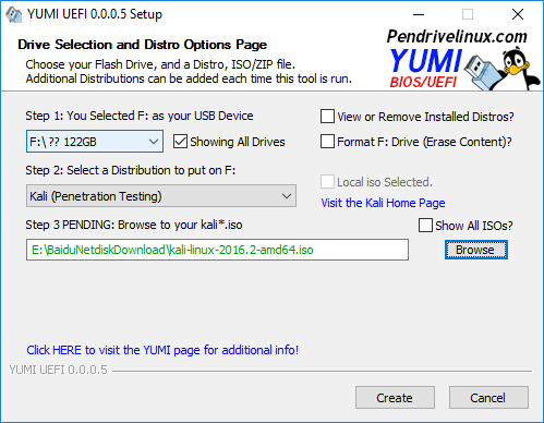 有三個步驟,第一步,選擇你要寫入的U盤盤符,下圖中是F,如果是第一次可以勾選格式,如果U盤有數(shù)據(jù),要先備份保存;第二步選擇鏡像的發(fā)行版,這里我想安裝的是kali;第三步是選擇鏡像文件,然后點(diǎn)擊“創(chuàng)建”按鈕,等待完畢就可以了。
