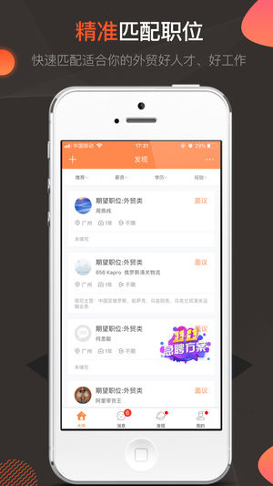 2、招聘求職:為電商外貿(mào)的企業(yè)和求職者提供人才招聘、求職、找工作、在線溝通等人力資源服務(wù)。