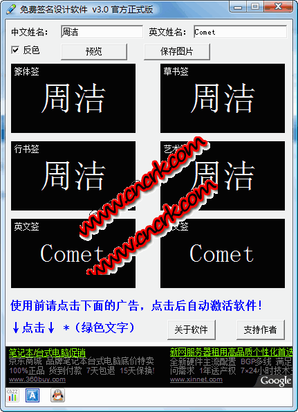 免費簽名設計軟件主要是設計個性簽名使用,軟件完全免費無任何功能限制,希望使用軟件的時候能點擊廣告支持作者的開噶!本軟件支持:中文個性簽名免費設計和英文個性簽名免費設計,軟件有在線智能探測升級系統(tǒng),有最新的個性簽名設計字體庫將會在線更新,本軟件設計的個性簽名包含:篆體個性簽名,草書個性簽名,行書個性簽名,藝術個性簽名 等等,希望你擁有本軟件后能設計出獨一無二的個性簽名!軟件無需安裝,解壓即可使用,無任何系統(tǒng)殘留,絕對是安全綠色的個性簽名軟件,設計好自己的簽名后,直接保存為圖片格式,就可保存在自己的電腦上!