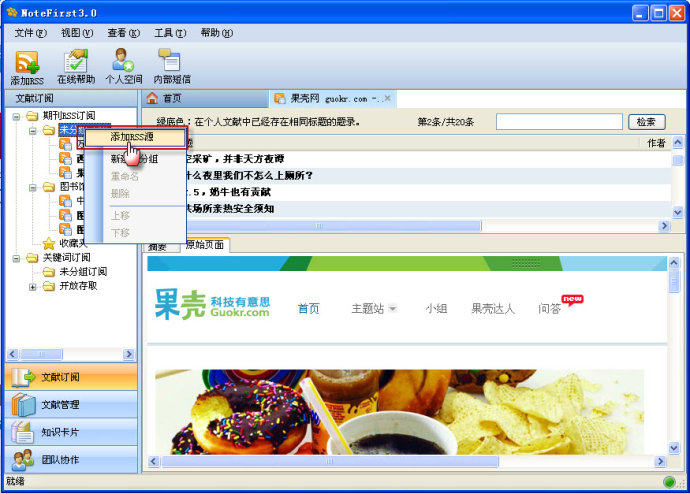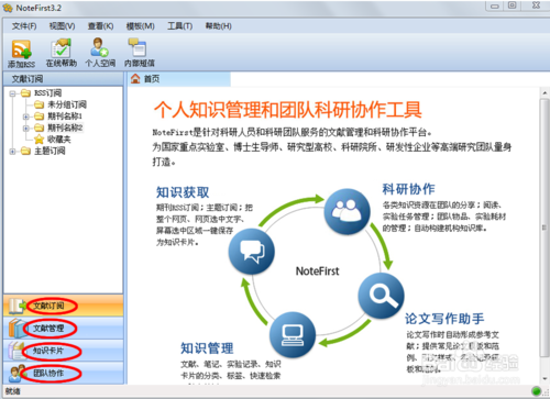 如圖,在軟件左下角有四個(gè)選項(xiàng),即文獻(xiàn)訂閱,文獻(xiàn)管理,知識(shí)卡片,團(tuán)隊(duì)協(xié)作。想用不同的功能就在此就行切換。