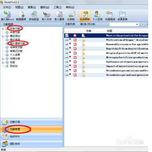 文獻(xiàn)管理功能就是有效整理你所閱讀過(guò)的文獻(xiàn)并可以做標(biāo)記。首先右擊左上角的“所有文獻(xiàn)”建立個(gè)人文件夾,可以建立“中文”、“英文”、“電子”、“通信”等形如此類的文件夾;然后選中你所建立的文件夾,點(diǎn)擊“導(dǎo)入文件”將本地的文獻(xiàn)導(dǎo)入到該文件中。選項(xiàng)中還有“最近閱讀”“高價(jià)值度文獻(xiàn)”等選項(xiàng),可以更好的標(biāo)記文獻(xiàn)。