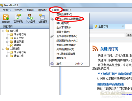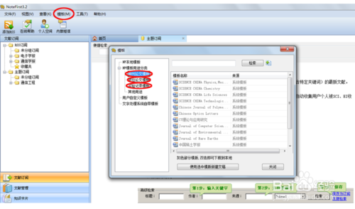 Notefirst除了這四大功能外,還有模版和參考文獻(xiàn)樣式功能。如圖所示,模版功能包括期刊模版、學(xué)位模版和實(shí)驗(yàn)記錄模版(都需要下載到本地);參考文獻(xiàn)樣式管理器在“工具”選項(xiàng)里面,包括國(guó)標(biāo)以及各大主要核心期刊的參考文獻(xiàn)樣式,科研工作者寫(xiě)論文的時(shí)候需要加參考文獻(xiàn),用Notefirst非常方便。