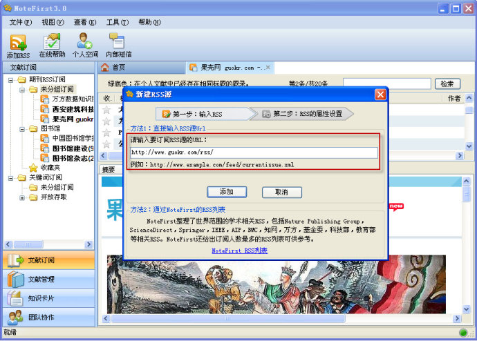 目前大多高校和研究院所都購(gòu)買了SCI、Springer等專業(yè)數(shù)據(jù)庫(kù),但要及時(shí)獲取本專業(yè)最新進(jìn)展,需要定期去訪問(wèn)這些網(wǎng)站。團(tuán)隊(duì)和研究人員希望相關(guān)專業(yè)的期刊、會(huì)議每有新文章發(fā)表時(shí),能自動(dòng)獲悉。NoteFirst 為積累性及時(shí)獲取提供了期刊RSS訂閱、關(guān)鍵詞訂閱、知識(shí)卡片獲取三種方法。