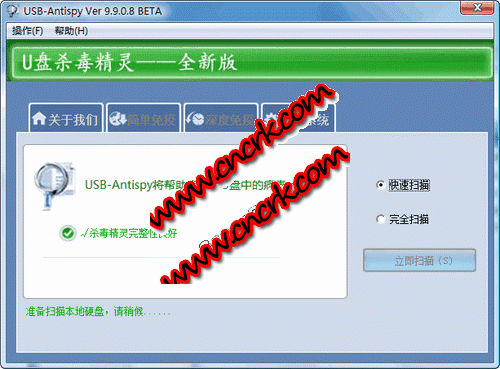 U盤殺毒精靈 V9.9.0.8 綠色免費版 本軟件是一款集u盤病毒查殺和免疫為一體的u盤病毒處理軟件!它采用全新的威脅識別方式,即根據(jù)u盤中病毒寄生的普遍規(guī)律和基本傳播原理進行判斷!從而克服了按病毒庫查殺u盤病毒反應(yīng)滯后的弊端,從而大大增強了對新病毒的反應(yīng)速度!