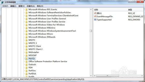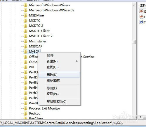 4、刪除HKEY_LOCAL_MACHINE\SYSTEM\ControlSet001\Services\Eventlog\Application\MySQL文件夾