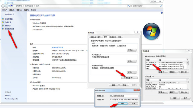 7、右鍵點擊計算機,選擇屬性,依次點擊高級系統(tǒng)設置》高級》環(huán)境變量,點擊新建,新建變量,變量名為:MGLS_LICENSE_FILE,變量值為:C:\Program Files (x86)\MentorMA\mgcld_SSQ.dat,然后點擊確定即可完成破解