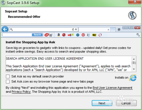 SopCast安裝界面是英文的,因此有些英文水平低的朋友們只好看也不看就“next"點個不停。本人在這里提醒大家出現這個界面時要放慢,第二個框是將把www.ask.com作為你的主頁,ask在美國是介于谷歌,雅虎,必應之后的第四大搜索引擎,不過界面是英文的,有需要的朋友可以打鉤。第一個框是安裝ask搜索擴展類似于百度搜索工具欄,本人不建議打鉤并且卸載起來比較麻煩。