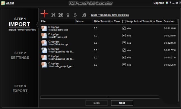 步驟1:導(dǎo)入PowerPoint Files-單擊“大紅色加號(hào)”按鈕將所有PowerPoint文件導(dǎo)入程序,然后按“下一步”按鈕。按鈕將所有PowerPoint文件導(dǎo)入程序,然后按“下一步