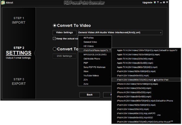 在這里,我們選擇“ iPad iPod iPhone Apple TV - > iPad H.264視頻(960x720)(HD)(。mp4)默認(rèn)為iPad ”作為目標(biāo)格式,將所有PowerPoint文件轉(zhuǎn)換為高質(zhì)量的mp4視頻,以便在iPad上播放。