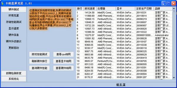 卡機(jī)藍(lán)屏克星是一款木馬克星工作室制作的電腦硬件檢測軟件,本軟件可以自動(dòng)識(shí)別硬件,并安裝驅(qū)動(dòng),支持硬件性能檢測,檢測后提示用戶硬件排名,并每日提供硬件性能排行,或品牌機(jī)性能排行。只需要輸入硬件名稱就可以知道硬件性能,是購買硬件,防止奸商修改硬件編碼的利器,同時(shí)指示云計(jì)算和win7,win64系統(tǒng),新的游戲評測軟件,直接顯示硬件性能排行榜,只要輸入硬件品牌或者型