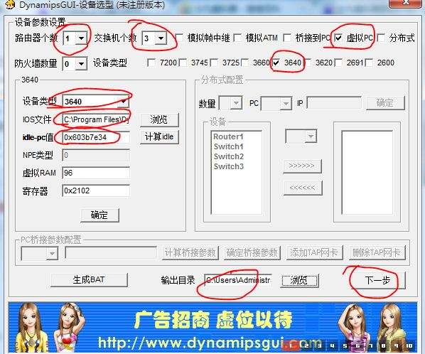 ①:此區(qū)域是選擇交換機(jī)和路由器的個(gè)數(shù)(有點(diǎn)廢話)②:這個(gè)地方是選擇設(shè)備類型,IOS路徑,idle-p值NPE類型,虛擬(表示虛擬設(shè)備的RAM所占的內(nèi)存大小,因?yàn)閐ynamips在模擬時(shí)候需要將主機(jī)的物理內(nèi)存模擬成模擬設(shè)備的RAM)